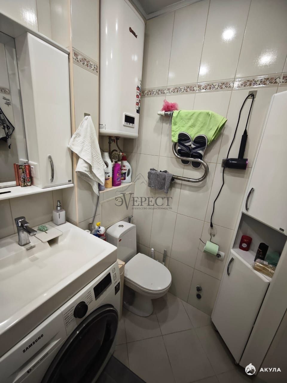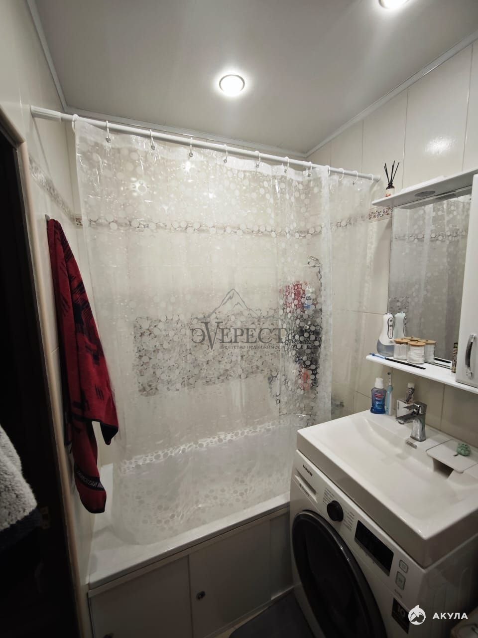 * Ванная комната и сан.узел совмещены, стены облицованы плиткой.