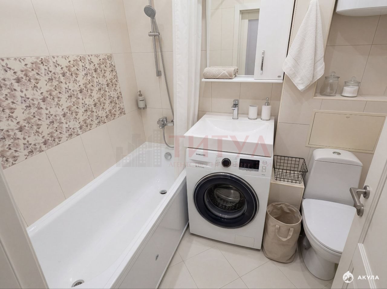 Оснащение санузла: Современная сантехника и стиральная машина.