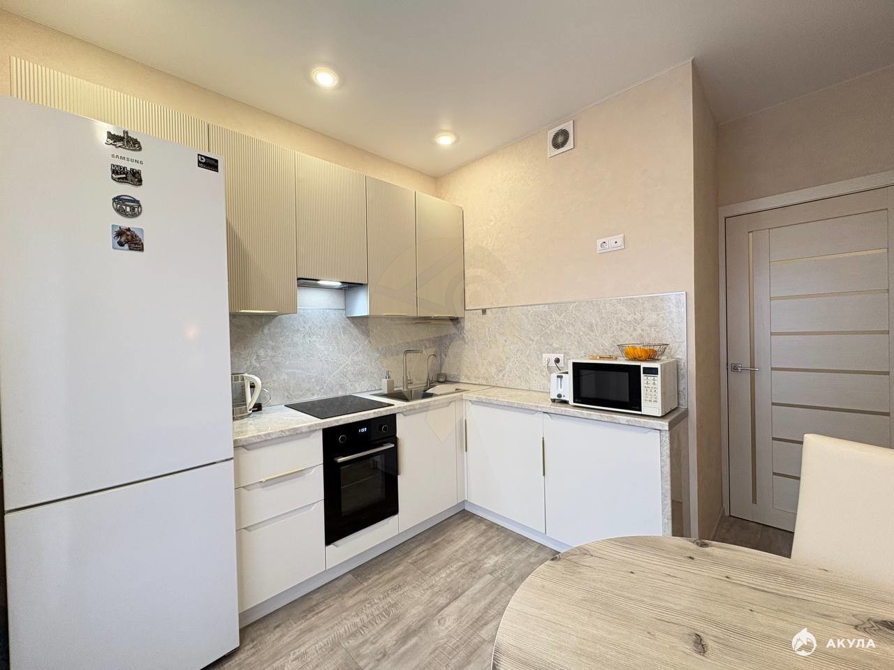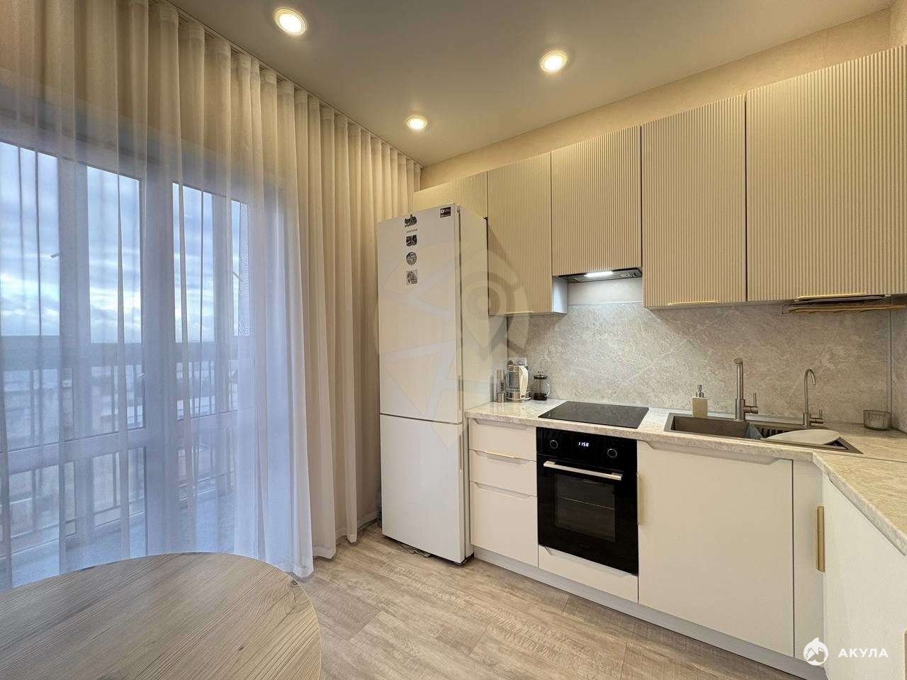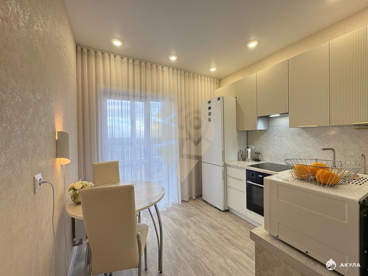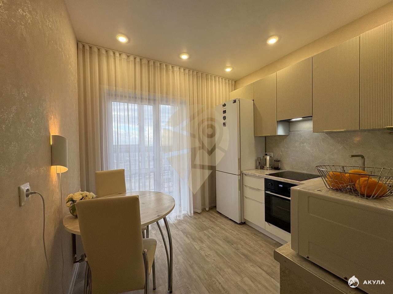 При продаже остается кухонный гарнитур, бытовая техника частично, мебель в гостиной.