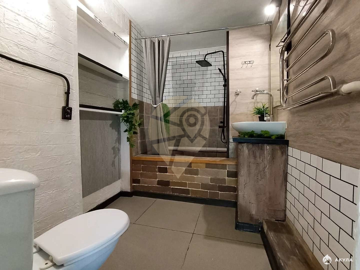 Санузел совмещенный в кафеле до потолка;
